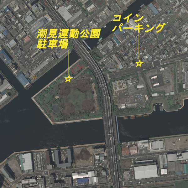 潮見運動公園の周囲の護岸から釣りができ、ハゼ・クロダイ・スズキなどが釣れる。潮見運動公園の駐車場は日中しか利用できないので、夜間に釣りをする際は少し離れるが近隣のコインパーキングを利用するといい。潮見運動公園駐車場の料金は3時間半まで30分100円、以降1時間100円。営業時間についてはこちらのサイトを参考にして欲しい。